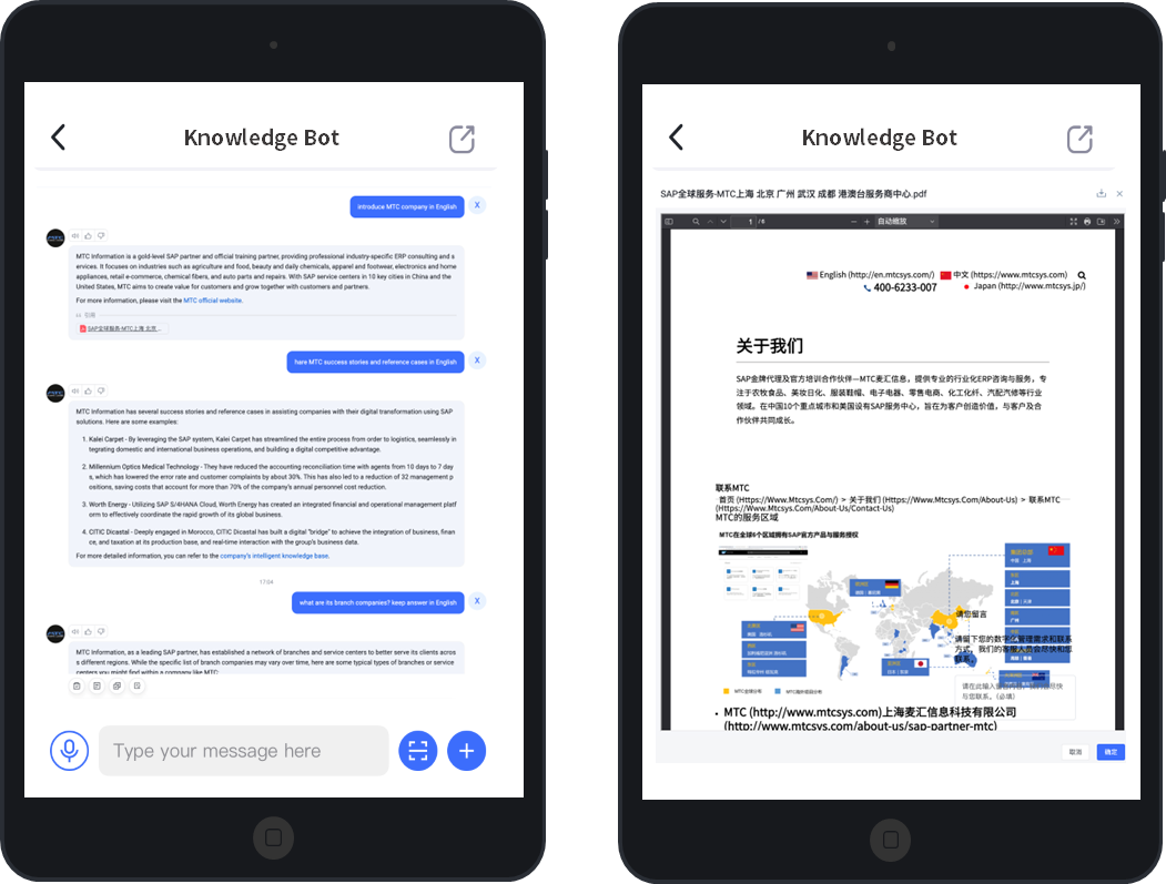 MTC Enterprise Assistant is built on cutting-edge artificial intelligence technology, deeply integrating internal and external enterprise data and knowledge for wide application across all aspects of business operations and management. By providing personalized and intelligent interactive services, it effectively enhances employee productivity and customer satisfaction, empowering enterprises to achieve intelligent transformation and boost competitiveness.